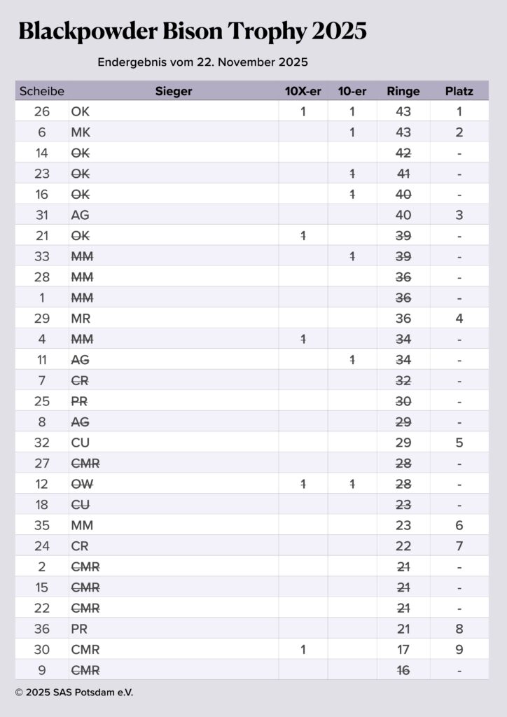 Veröffentlicht am 22. November 2025 von Ralf SchmidtBlackpowder Bison Trophy Run Endergebnisse vom 22. November BP-Bison.2025 DSGVOHerunterladen