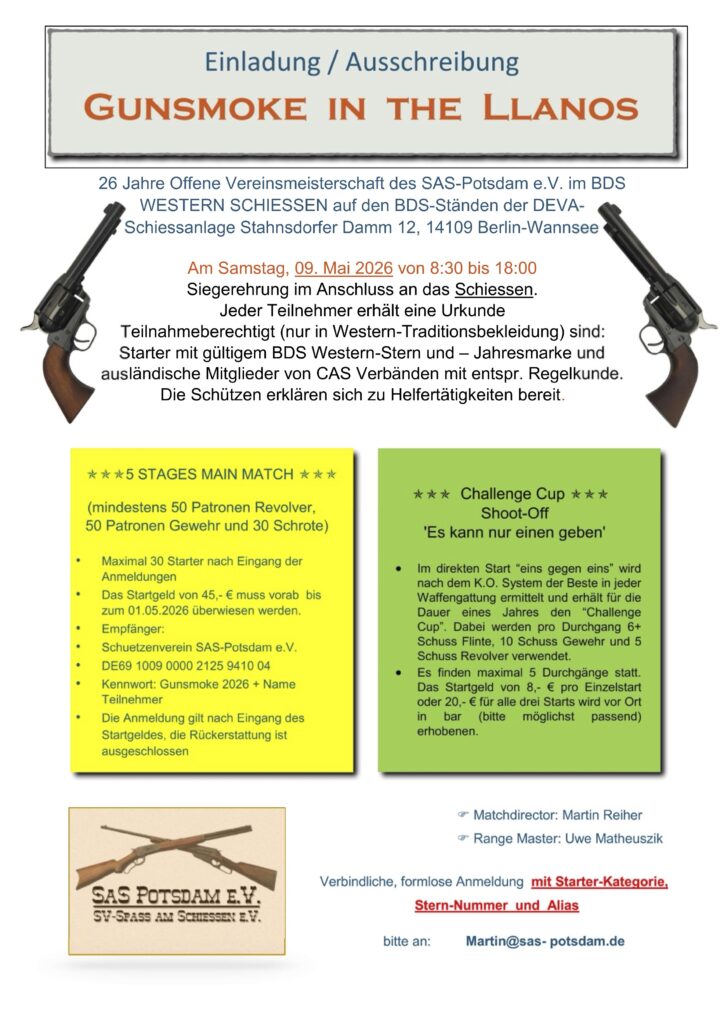 Veröffentlicht am 8. März 2026 von Ralf Schmidt„Gunsmoke in the Llanos 2026“ Offene VM des SAS Potsdam e.V. Ausschreibung Gunsmoke in the Llanos 2026Herunterladen
