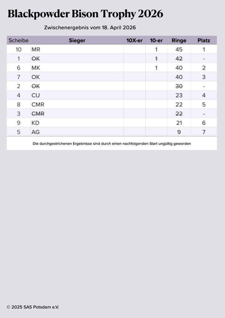 Veröffentlicht am 18. April 202619. April 2026 von Ralf SchmidtBlackpowder Bison Trophy Run Zwischenergebnisse vom 18. April BP-Bison Zwischenergebnisse 2026.04.18Herunterladen